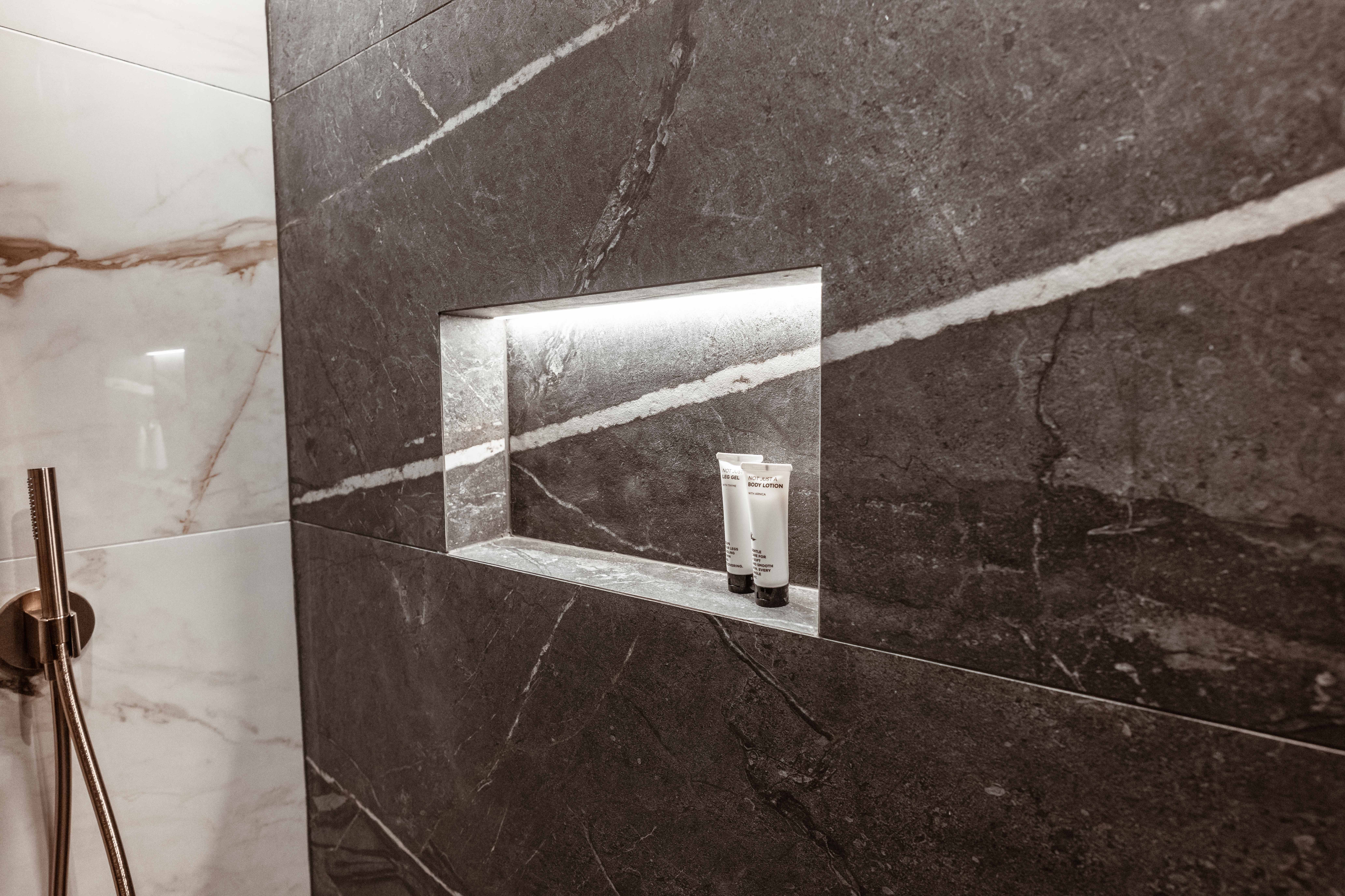 Ein besonderes Highlight ist die Anfertigung von Waschtischen direkt aus Fliese, was nicht nur ein einzigartiges Designelement darstellt, sondern auch höchste Pflegeleichtigkeit und Robustheit garantiert. Die Nischen in den Duschen wurden mit einer stilvollen LED-Hintergrundbeleuchtung versehen, die für eine stimmungsvolle Atmosphäre sorgt und gleichzeitig praktische Ablageflächen bietet. Die Ausführung der Eckkanten im Jolly-Schnitt unterstreicht unsere Präzision und das handwerkliche Geschick, das in jedem Detail steckt.